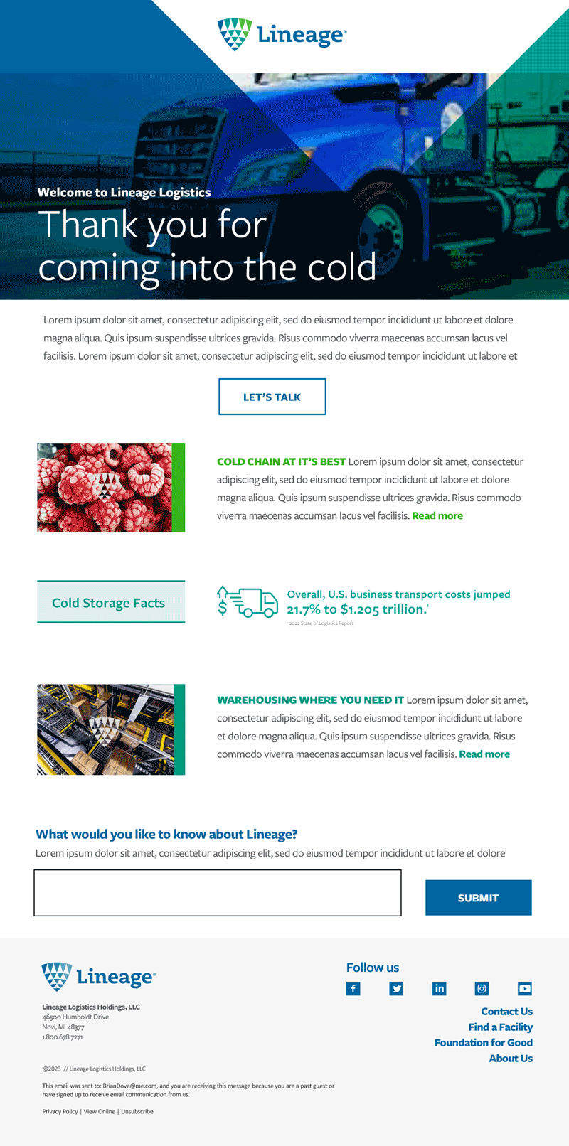 Global delivery of goods and services email welcome series that features the company's Cold Storage capabilities being world-class